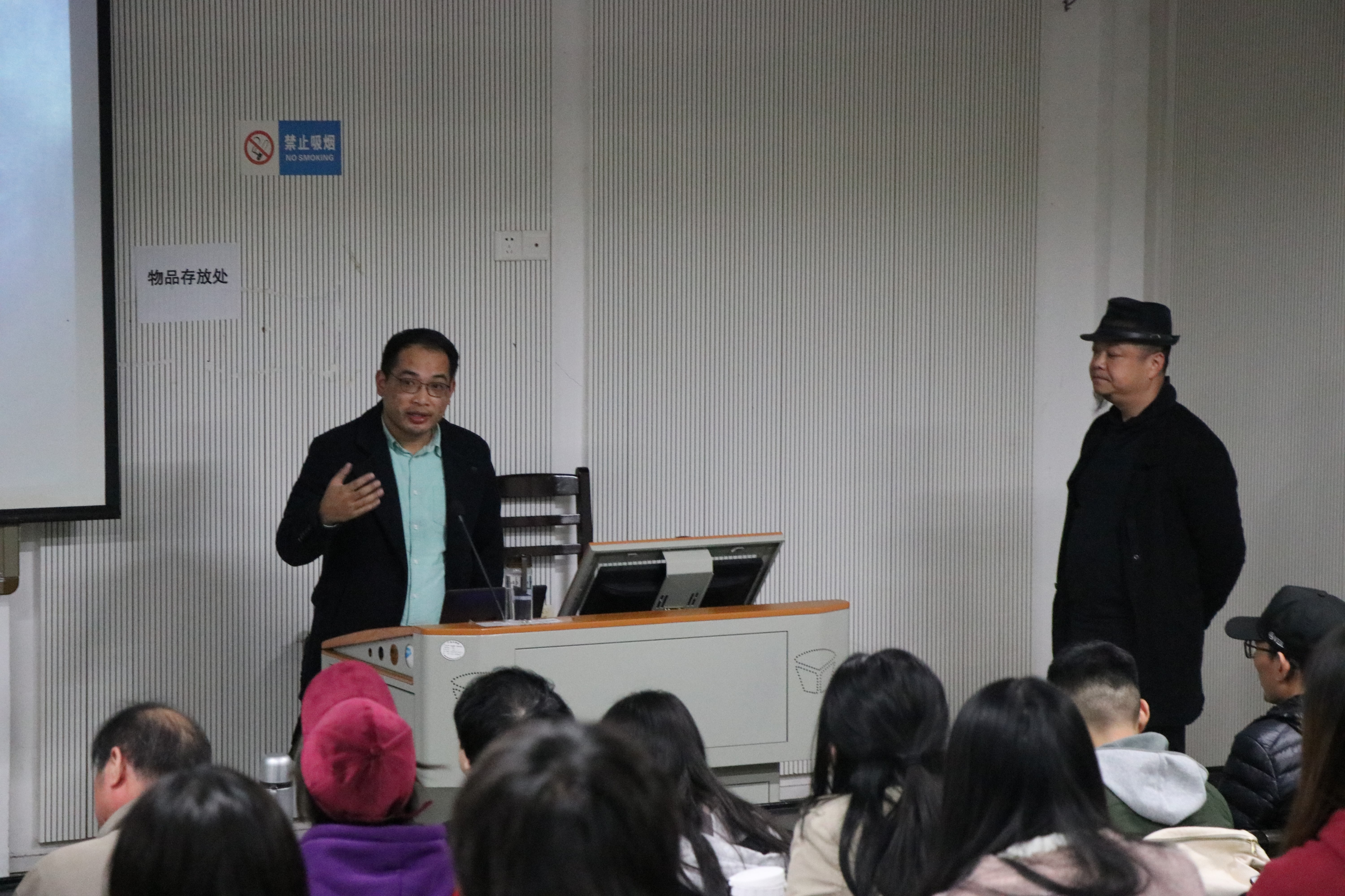 首先由工业设计系戏剧影视专业教研室主任贺诚老师主持介绍郑靖老师,郑靖是中国美术学院副教授、博士,中国美术学院公共艺术学科带头人,雕塑与公共艺术学院院长助理,公共空间艺术系系主任,艺术工程与科技工作室学术主持,浙江省高校中青年学科带头人,浙江省雕塑研究会理事,“Z”轴空间艺术工作室创始人。