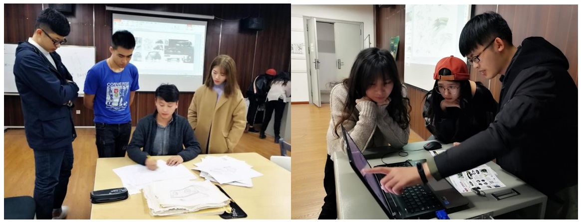 宣讲结束后,两位学长和学弟学妹们近距离的沟通指导作品集的改进方案,演示如何训练自己的手绘表达技能,交流怎样从某个形体线衍生而来成为新的汽车造型设计。此次学习交流活动让在校同学对工业设计就业前景能有一定的了解,并更进一步了解汽车设计的设计方法与设计程序。