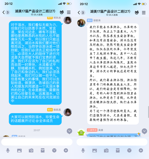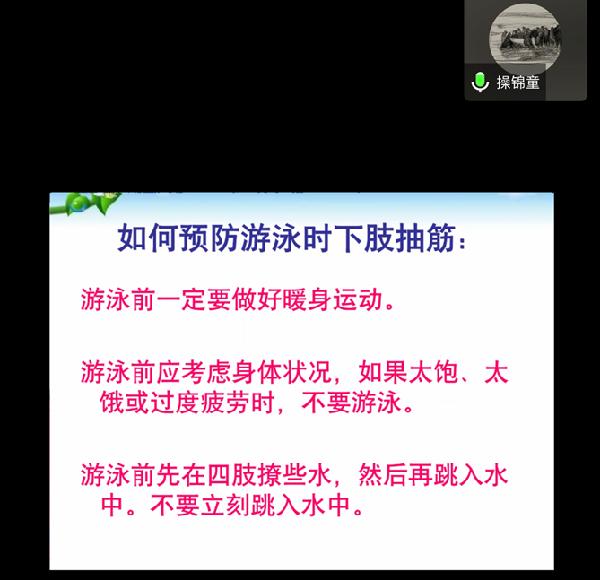 本次活动各班开展防溺水安全教育主题“云”班会,主要围绕宣传预防溺水常识和溺水救护方法展开。各班积极响应我系活动宣传工作并高度重视,经过多方查阅资料,结合实际,各班通过直播通话、问答、腾讯会议等多种线上方式,向同学们讲解了预防溺水安全的基本常识和溺水时的紧急救护方法。会议期间,师生积极互动,讲求实效,我系辅导员为同学们做出正确的思想引导,同学们踊跃分享自己的经历故事和了解到的防护小知识,体现了作为新时代的大学生,对于自我安全教育的积极主动性,提高了责任意识和防护意识,牢固“珍爱生命,安全第一”的意识。会上学生观看有关防止溺水短片,探讨自身应该如何防范、自己或他人遇到溺水如何处理、应对溺水事故如何保持清醒的头脑等方面问题。各班都对此次防溺水安全教育主题班会做了详细记录,进行了及时收集、整理主题班会资料,及时总结、推广等相关宣传活动。同学们踊跃发言,积极参与话题讨论,表达了作为一名学生对自身安全防护意识的重视,对自我教育的主动性。