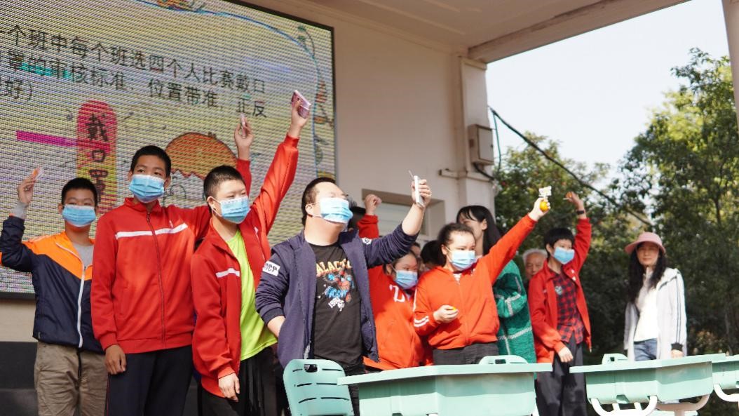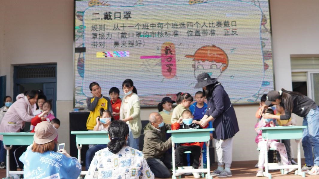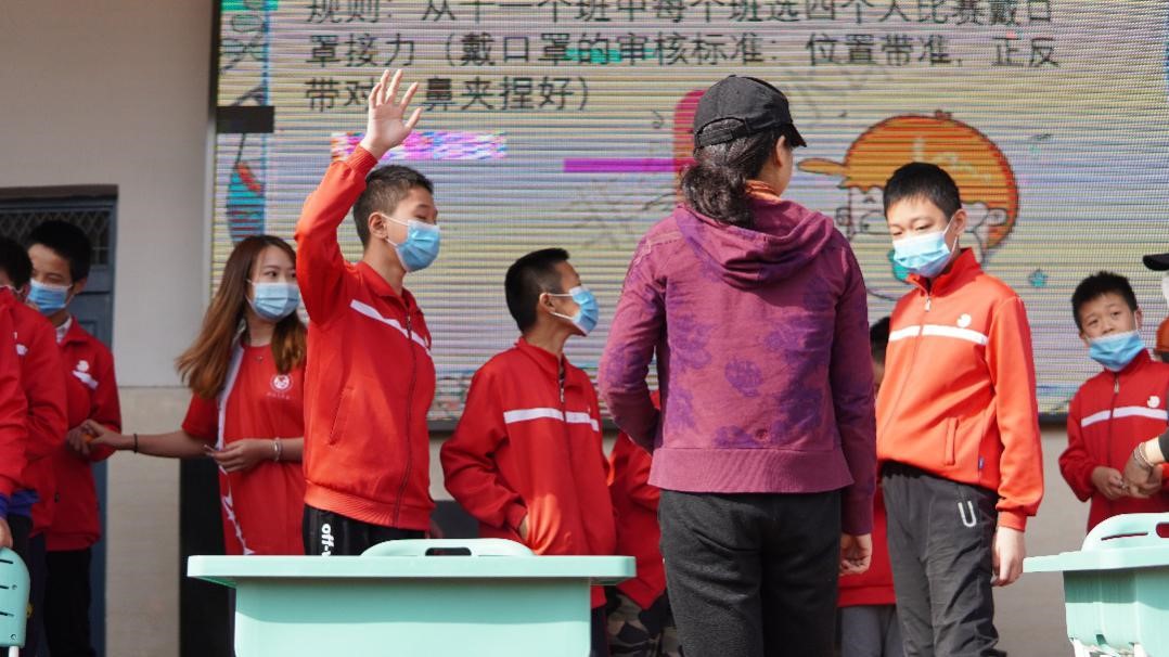 戴口罩接力中孩子们激动地参与