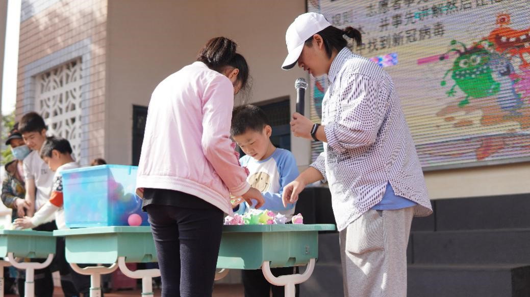 孩子们在海洋球里寻找志愿者们制作的病毒标本