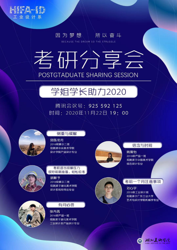 为进一步加强同学们对研究生入学考试的认识,帮助考研学生排解考前压力、充分做好考前准备,工业设计系于2020年11月22日19时通过腾讯会议线上举办了考研分享会:学长学姐传帮带,给学弟学妹考研助力。工业设计系毕业年级辅导员李小青、2016级学姐邱陈冬月、姚复怡、胡释予、张丹芮和学长刘心宇以及2017级考研学生参加了此次线上考研分享会。