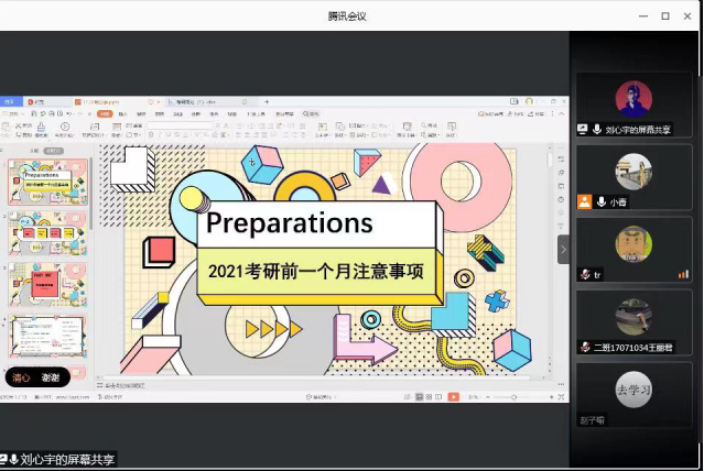 此次线上考研分享会的顺利完成离不开领导的大力支持和辅导员老师的精心组织和号召,以及离不开2016级学长学姐对学校、对系部及对学弟学妹的深切热爱。希望通过此次分享,能让同学们对考研过程有了一个更具体、更清晰的认识,更坚定、更自信地迈进考场,交上一份让自己满意的答卷。