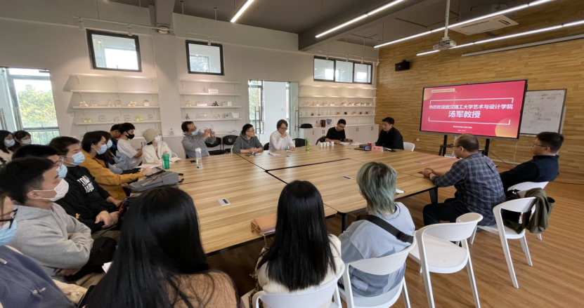 其次,汤军教授也详细讲解了设计方法论课程的建构,如何掌握正确的设计研究方法,以及怎样提高学生的思辨能力和研究能力。通过采用观察和案例研究对比,对进行授课方式、并在教学内容和考评方式等方面进行分享,使研究生在实践过程中完成从“设计”到“研究”角色的转变。另外,汤军教授以研究生课程《生活设计与产品开发》课程为例,强调与其他学科知识的交叉,侧重引导研究生掌握该门课程的学习方法并加以应用。讲座最后,研究生导师及研究生与汤军教授就行交流。