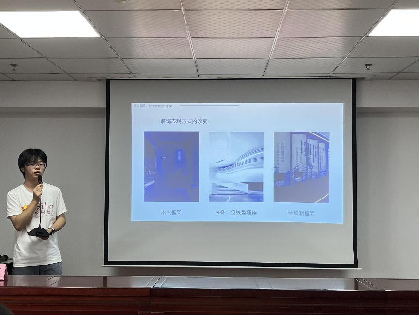 会议伊始,小组代表胡清雅、谌异辰、刘一恒依次对五峰民贸电商园、五峰汲明茶叶有限责任公司、五峰万绿电子商务有限公司的设计方案进行汇报。三组设计人员针对企业的实际需求,结合五峰当地特色文化,分别介绍了各自的设计灵感来源,制定符合企业特色的设计方案,并作最终的效果展示。