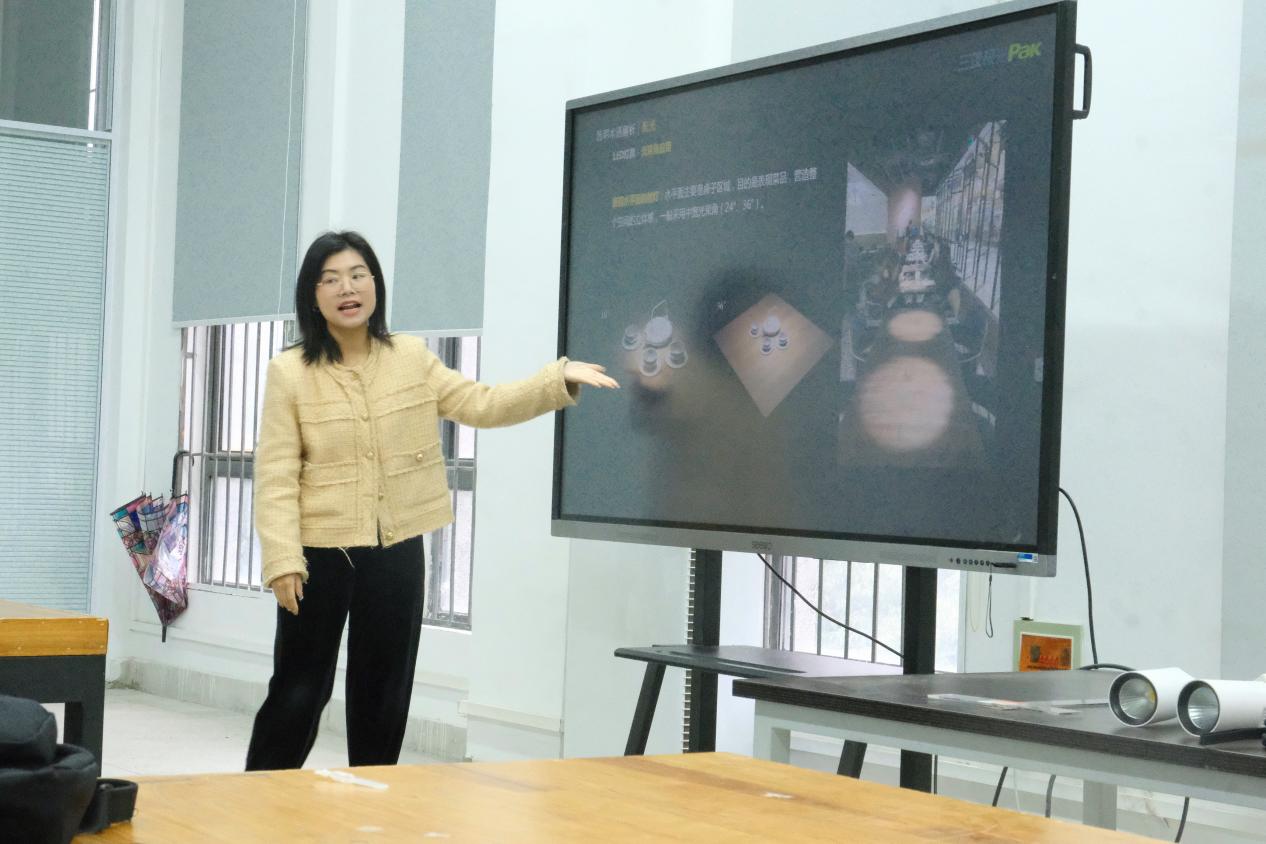 光与影的表现是展示设计项目中的重要一环,设计师通过照明设计将设计信息更清晰地呈现在观者眼前。在讲座中杨凌燕提出如何利用光来吸引观众注意力,提升空间展示效果的设计方法。通过了解观众的需求和情感变化;把握空间要素条件;然后结合产品功能、结合实际场景进行设计;最后将设计构思付诸实践。杨凌燕老师以真实项目经验向学生分享设计过程中室内设计师如何根据空间功能及空间位置合理布局,以及借助照明设计来呈现空间中应有的氛围和文化内涵。使学生理解室内设计与照明设计之间是紧密联系和相互促进的关系。