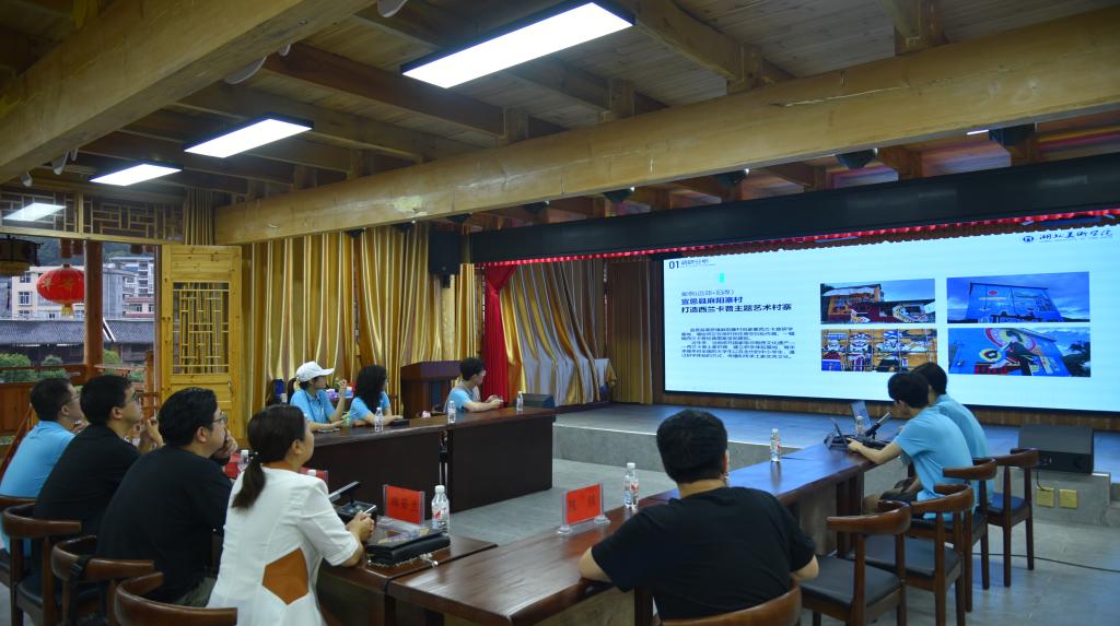 在来到该公司位于市区和宣恩县麻阳寨的研学基地后,通过实地参观、与传承人座谈、亲自体验织绣技术,团队成员感受到了西兰卡普的历史渊源、美学特点、精湛工艺和艺术魅力。团队成员立足特定群体的消费心理和习惯,结合西兰卡普的文化特点,确定了产品设计方案。指导老师在非遗传承人田若兰的陪同下参观了乡镇部分景点,就乡村文化艺术建设进行交流。期间,校领导张以林、程智力看望慰问了团队成员并提出了工作期望。