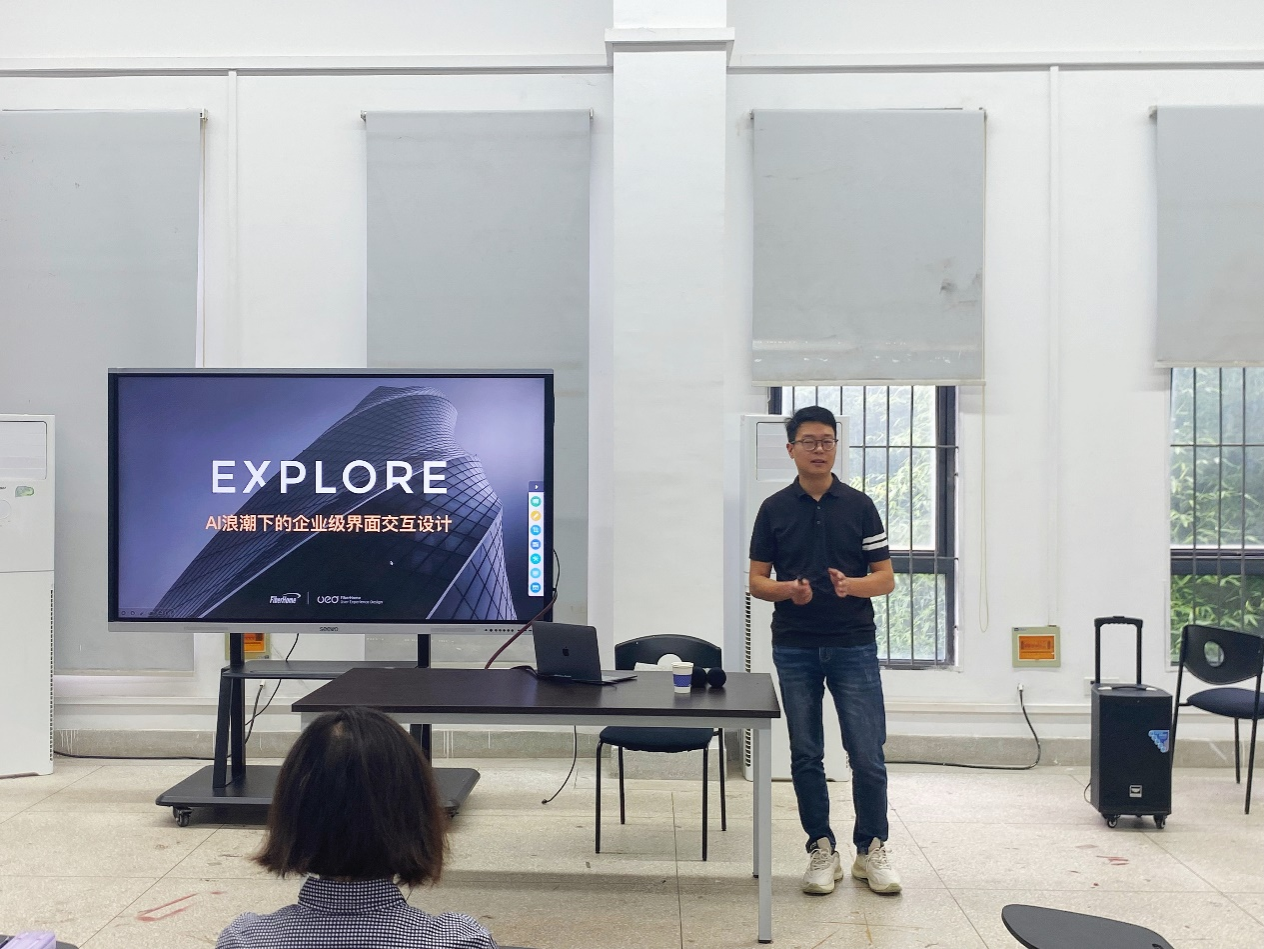 会上,李奕老师首先对马腾飞先生的到来表示了热烈的欢迎,并向与会师生简要介绍了马腾飞先生在交互领域的成就和贡献。随后,马腾飞先生从烽火公司的UED项目经历,企业级界面交互的变革,企业设计流程,AI带来的挑战和机遇等多个方面,深入浅出地与大家进行了交流。他强调,他深入剖析了在 AI 浪潮席卷的当下,企业界面交互设计所面临的机遇与挑战。通过生动的案例和精彩的讲解,阐述了如何更好地利用 AI 技术提升界面交互的效率和用户体验。