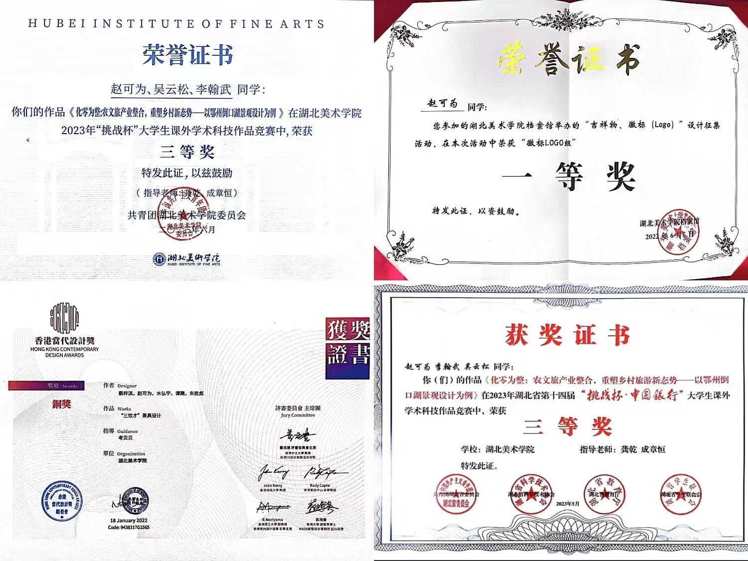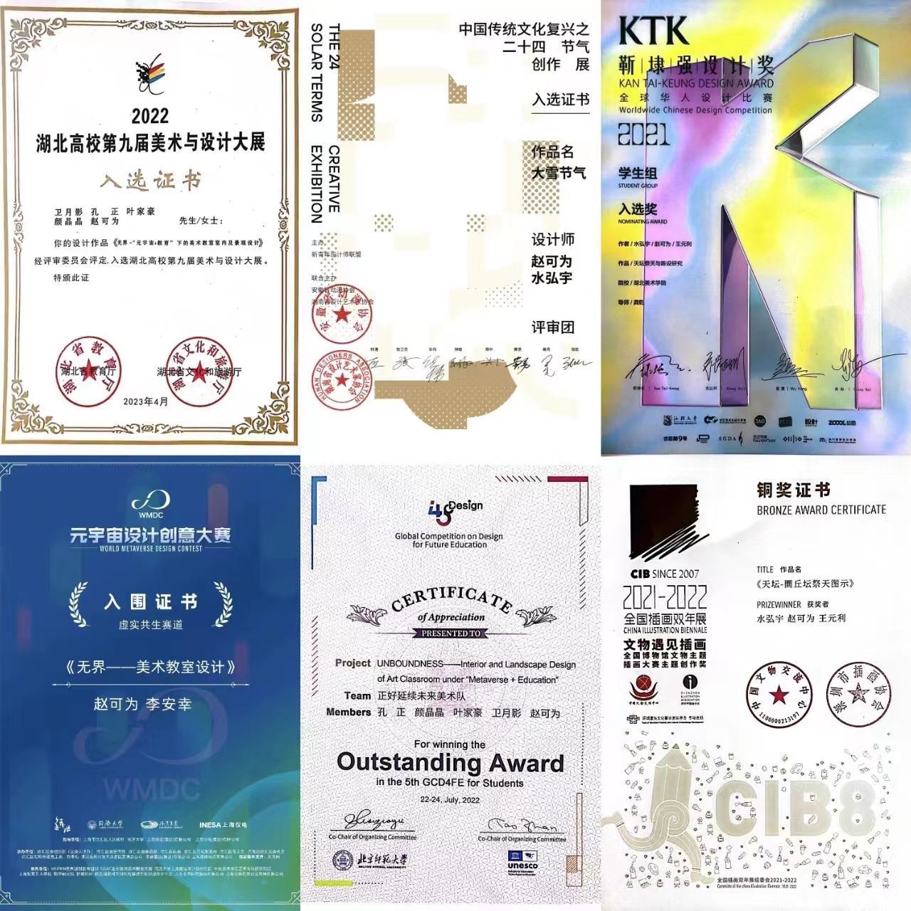 赵可为同学积极参与校内外各种学科竞赛,以优异的成绩屡获殊荣。曾获第十四届“挑战杯”大学生课外学术科技作品竞赛三等奖;2021-2022全国插画双年展铜奖;湖北高校第九届美术与设计大赛入选;KTK靳埭强全球华人设计比赛入选;联合国教科文组织全球未来教育设计大赛优秀奖;香港当代设计奖铜奖;上海徐汇区政府元宇宙设计创意大赛入选奖;获湖北美术学院档案馆设计大赛一等奖;湖北美术学院百年校庆大赛三等奖;中国传统文化复兴之二十四节气创作展入选。这些荣誉不仅是对他个人努力的肯定,也为学校争得了荣誉。在备赛过程中,赵可为展现出了高度的团队合作精神和卓越的解决问题的能力,不仅提升了自己的专业技能,也积累了宝贵的竞赛经验。