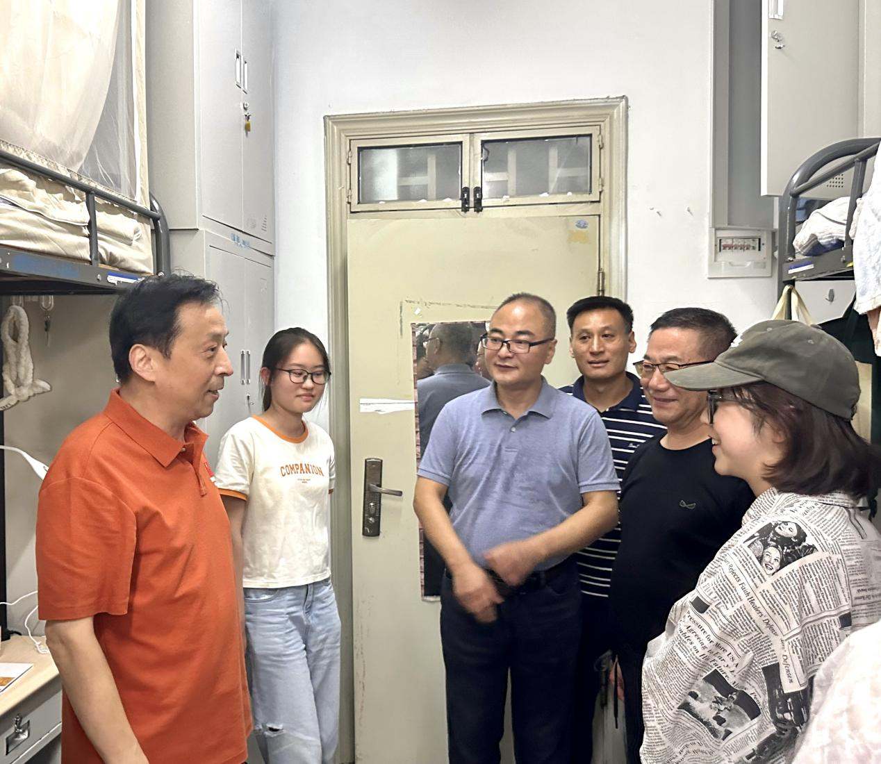 走访过程中,领导老师们认真查看新生宿舍的各项设施设备,询问同学们的生活情况,倾听同学们的心声。“同学们,你们好呀!”“你们都来自哪里呀?”“到校第一天,还适应吗?”“有什么困难需要我们帮助解决吗?”…… 一句句真挚的问候迅速拉近了师生之间的距离。张以林勉励学子们在人生的新阶段新起点,积极融入大学校园生活,科学规划未来四年学业生涯,充分利用学校提供的优质教育资源,勤学不辍、强身健体、怀抱梦想、脚踏实地,努力提高专业素养和个人综合素质,以自身拼搏奋斗描绘无悔青春画卷。