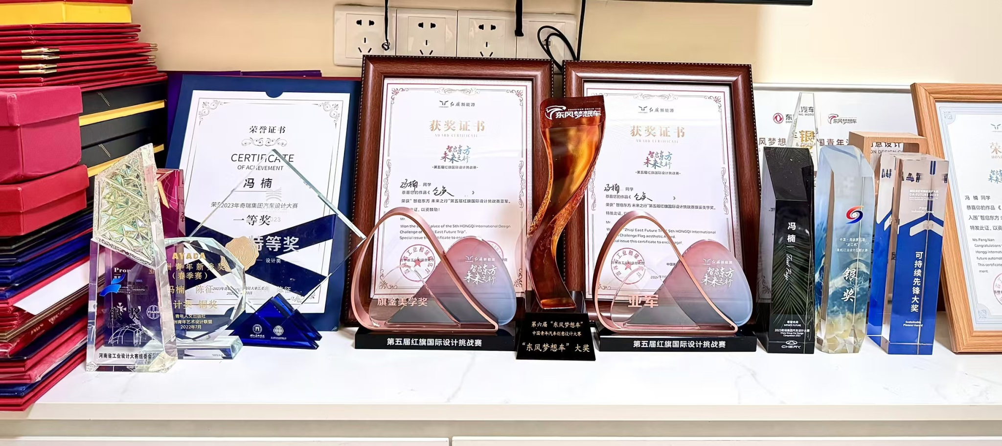 冯楠深耕汽车设计与智能网联技术,在杨艺教授的指导下,她设计的《滚翼式勘探皮卡车》在第六届“东风梦想车”青年汽车设计大赛中获得“全国总冠军”,被行业专家评价为“未来特种车辆设计的革命性突破”,纳入东风技术储备库;作品《智能牧场分离式运输车》在“奇智未来”青年汽车设计大赛中获得“全国总冠军”;作品《仑奂》斩获第五届红旗国际设计挑战赛“全国亚军”,获红旗设计院专家高度评价,纳入红旗概念车设计储备库。冯楠在三大赛事中斩获“两冠一亚”顶级奖项,体现了其设计能力覆盖技术创新(奇智未来)、行业实用(东风梦想车)、文化高端(红旗挑战赛)三大维度。她带领团队设计的作品“和平精英联赛活动项目产品设计”“牧马人汽车改装套件产品设计”“东风梦想车奖杯设计”被腾讯、Jeep牧马人、东风等企业采用。