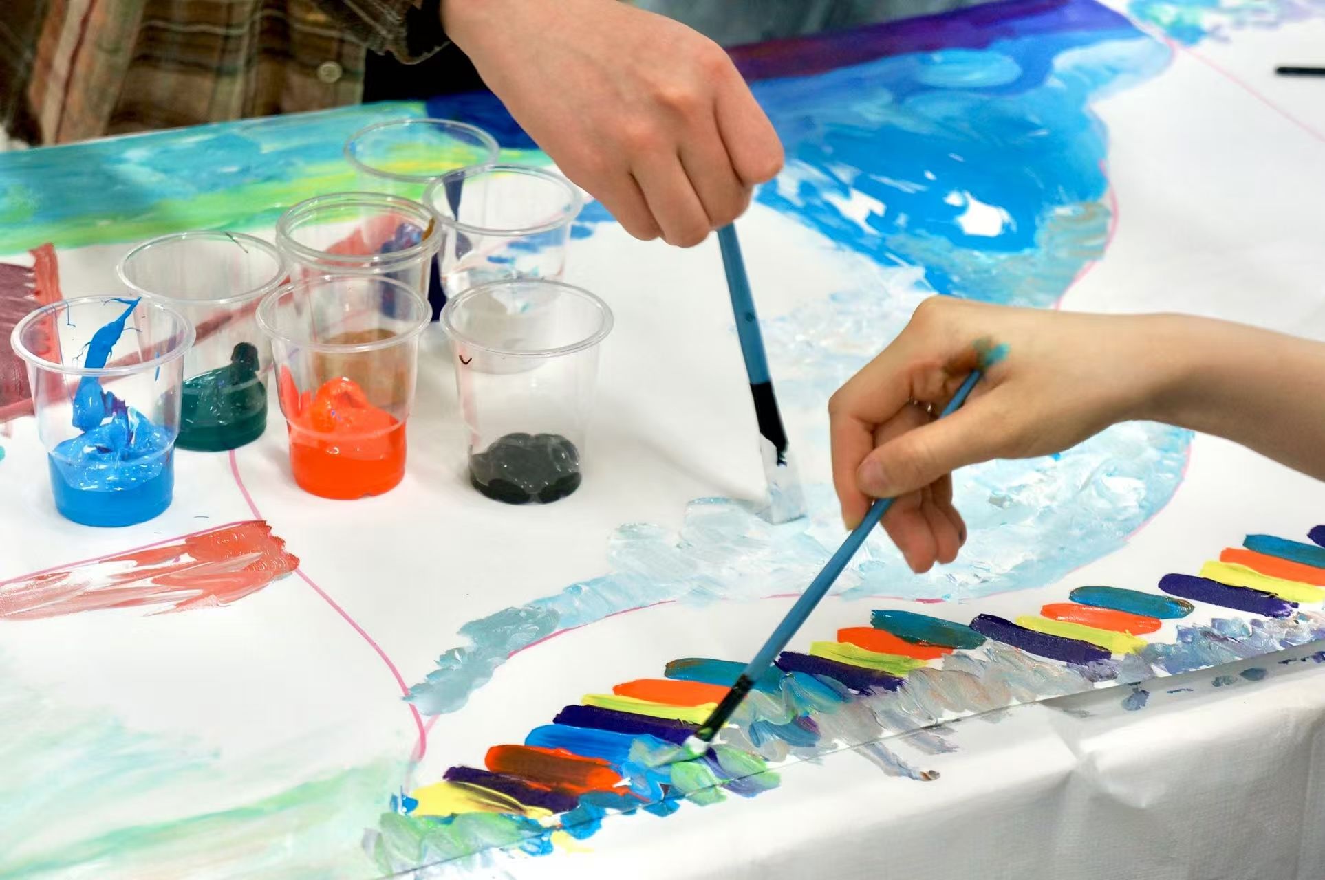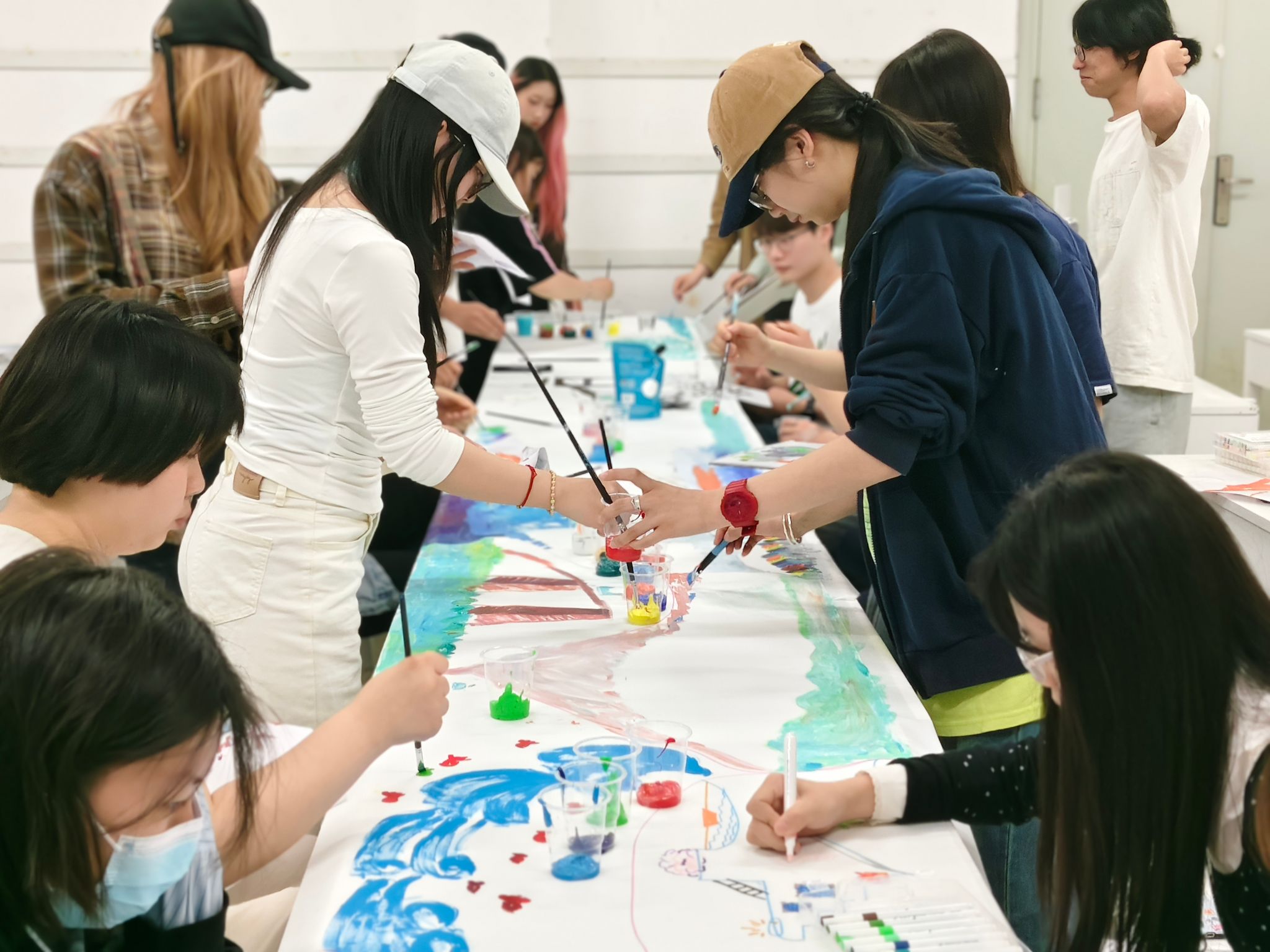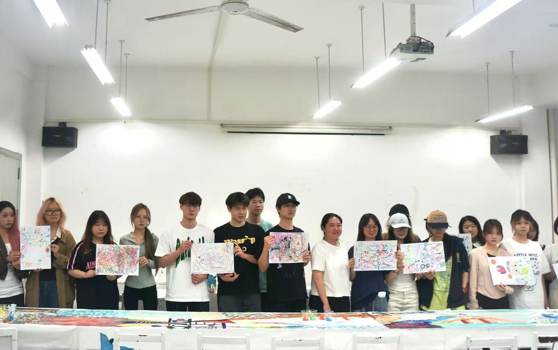活动以“声音与色彩的对话”为核心,巧妙结合环境音效资源,通过两个环节,学生们在激昂的鼓点中泼洒鲜艳色彩,于舒缓的钢琴曲中勾勒细腻线条,将听觉感受转化为视觉表达。现场铺设的长卷轴上,参与者们通过团队协作完成了一幅长达6米的集体创作,画面从抽象色块逐渐演变为充满叙事性的场景,展现了“焦虑”向“希望”的情感转化。“当音乐停止时,我发现自己画出了内心最真实的情绪。”2022级展示设计专业刘乙慢分享道。江之乔老师表示:“艺术创作是潜意识的镜子,我们通过作品分析帮助学生实现自我认知与情绪管理,通过艺术创作帮助学生释放压力、表达情感,获得积极的心理体验。”