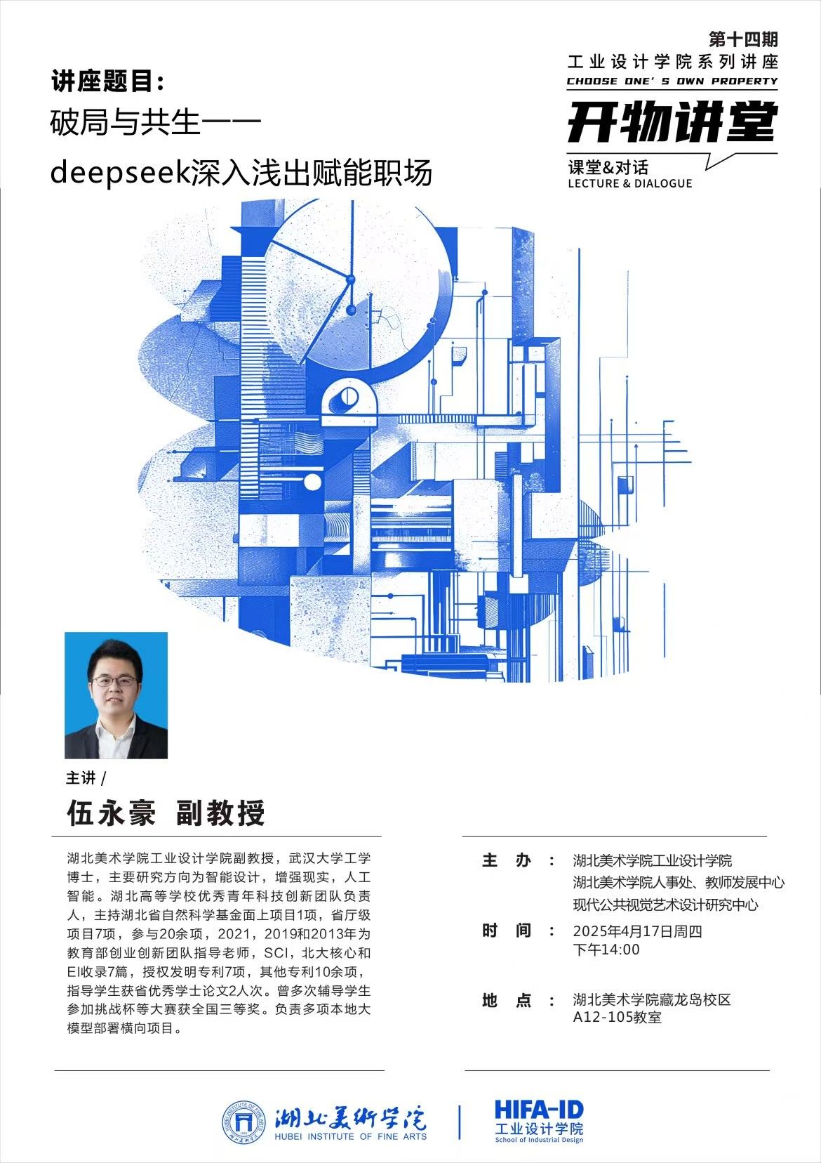 4月17日上午,工业设计学院伍永豪副教授在A12-105报告厅,为全校师生带来题为《破局与共生——deepseek深入浅出赋能职场》专题讲座。本场讲座也是工业设计学院青年教师培训项目活动之一,学院青年教师代表参加了本次培训活动。讲座由工业设计学院副院长张锐主持。