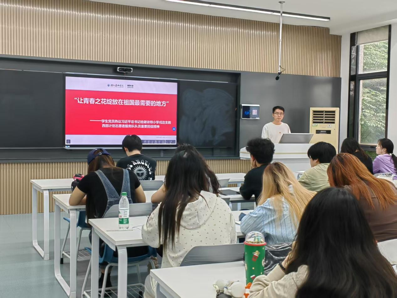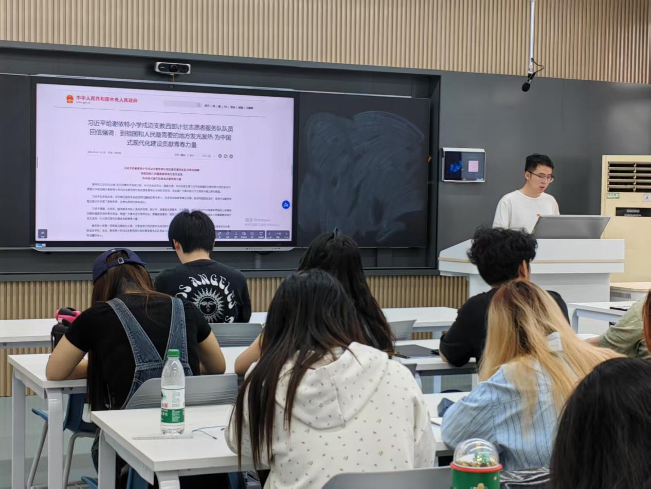 工业设计学院学生第一党支部书记李洋组织学生逐字逐句学习习近平总书记回信内容。回信中“希望广大青年坚定理想信念,厚植家国情怀,练就过硬本领,发扬奋斗精神,到祖国和人民最需要的地方发光发热,为中国式现代化建设贡献青春力量”的殷切嘱托,成为大家热议的核心。李洋在领学时表示:“总书记的回信是对新时代青年的青春命题。学院学子要用专业服务乡村振兴,用创意点亮基层发展。”随后,师生共同观看谢依特小学新闻纪实,了解在西部计划志愿者的带领下所发生的变化,一张张笑脸,拉进志愿者与当地孩子的距离,李洋从政策解读、典型事迹、政策保障、报名流程等方面对西部计划做了详细介绍,鼓励同学们去西部成就梦想。