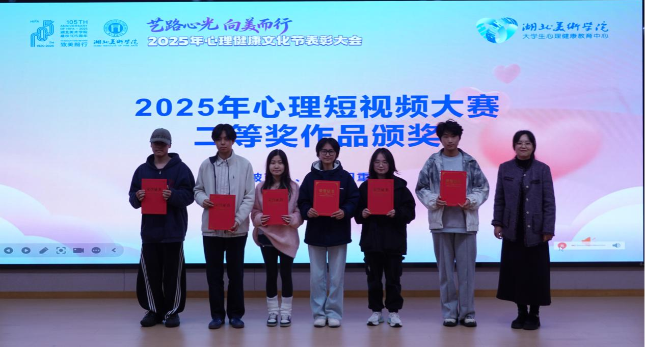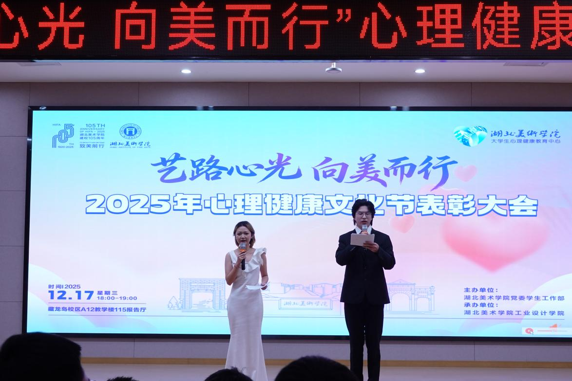 为系统总结心理健康文化节的工作实践与成效,进一步培育我校大学生积极心理品质,推动心育与美育协同育人,12月17日晚,我校2025年心理健康文化节表彰大会在A12-115报告厅举行。本次大会由工业设计学院承办,党委学生工作部、教学单位学生工作负责人、辅导员以及学生代表等出席大会。