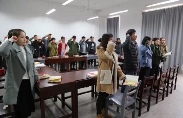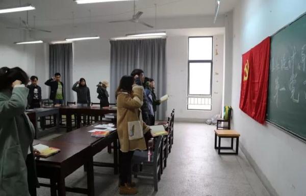 我系党总支书记汪早林同志、学生第一党支部书记陈菲同志带领各位党员、预备党员面向党旗庄严宣誓,重温誓词。