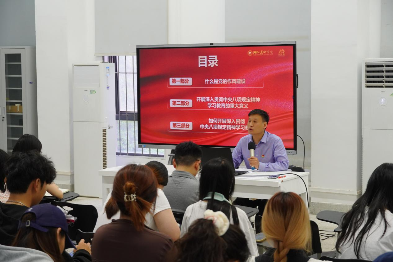 随后,李军讲授《以作风建设为抓手 凝聚干事创业合力》专题党课。他从什么是党的作风建设、开展深入贯彻中央八项规定精神学习教育的重大意义、如何开展深入贯彻中央八项规定精神学习教育三个方面进行讲解,深刻阐述了作风建设的必要性、中央八项规定精神学习教育的重要性以及深入开展中央八项规定精神学习教育的具体措施。他通过详实的内容、丰富的案例、通俗的语言,对学员进行一次深刻党性教育,并对在场学员提了要求,一要坚定理想信念,二要端正入党动机,三要敢于担当奉献,四要守住纪律底线,积极发挥先锋模范带头作用,热心服务师生,助力学校发展,投身强国建设。