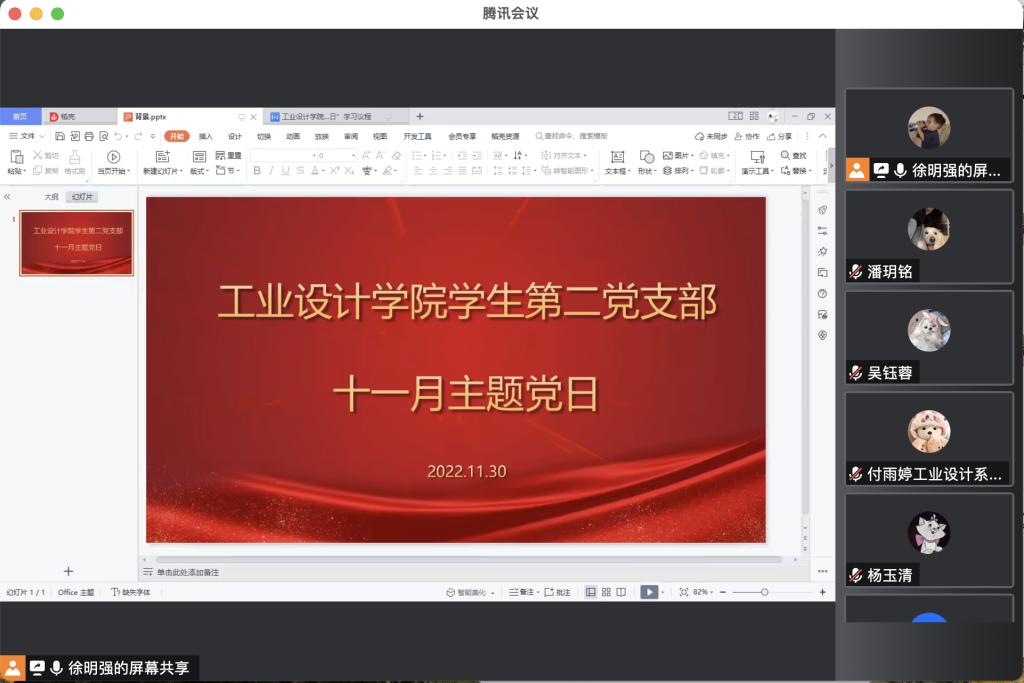 2022年11月30日,工业设计学院学生第二党支部在线上开展十一月支部“主题党日”学习,本次会议由学生第二党支部书记徐明强主持,本次会议的主要议程为:集体诵读党章、重温入党誓词、缴纳当月党费。工业设计学院第二党支部全体党员参加了本次会议。