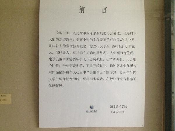 本次作品展以“美丽中国 从节约开始”为主题,旨在宣传中国传统美德,反对铺张浪费,弘扬校园新风和正能量。美丽中国,既是对中国未来发展的诗意表达,也是时下人们的热切愿望;美丽中国的实现需要美好心灵,净化心灵,从年轻人的廉洁教育做起,使当代大学生懂得做什么样的人,怎样做人,真正确立正确的世界观、人生观和价值观。建设美丽中国需要每个人从点滴做起,从节约做起,用力用心用情;美丽需要创意,工业呼唤设计,通过艺术创作形式,用作品描绘每个人心目中“美丽中国”的梦想,去引导当代大学生厉行勤俭节约、反对铺张浪费,积极践行艰苦朴素的优良作风。