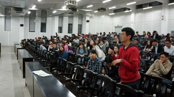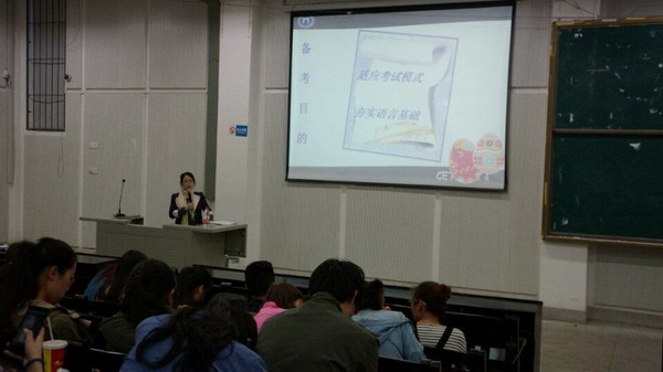 讲座主要围绕为什么进行四级备考、如何备考等问题展开。首先主讲人毛老师对四级试卷改版问题做了简要说明,着重对试卷构成和应对策略做了深刻剖析,同时强调了考试注意事项和考试流程。讲座中,同学们聚精会神,认真聆听并在重要的地方做适当的笔记。毛老师诙谐幽默而又严谨的语言引来了同学们的阵阵掌声。讲座过程中还穿插了学生提问环节和英语趣味问答环节。通过老师与学生间的互动带动了大家积极性,有趣的问答环节更是使现场气氛高涨。英语的独特魅力也在这场短短一个多小时的讲座中展现的淋漓尽致。