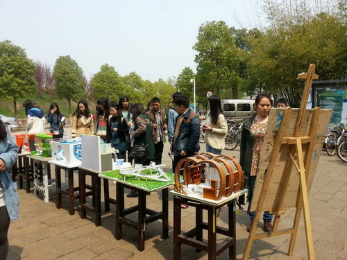 此次作品展主要展出了2012级展示设计专业学生的课程作业作品,展品主题桥与主题展厅分开摆在食堂门口,陆陆续续来进餐的同学逐渐聚拢过来参观作品,两天展品内容不同,可以让同学更加深刻了解到工业设计系的学业内容与学习的成果,展览期间安排专门的负责人给有疑问的同学讲解展品的理念、制作的过程以及软件制作的效果图等。