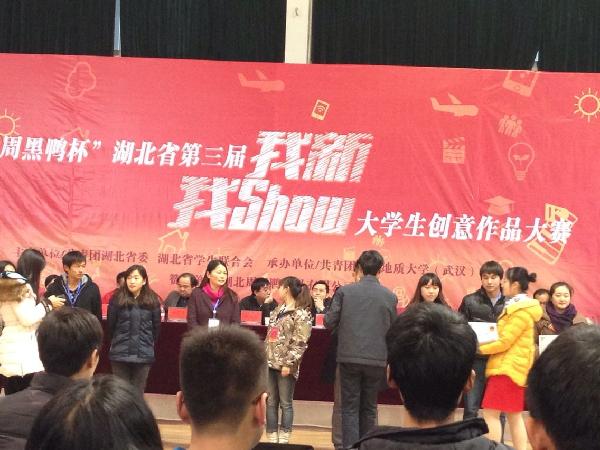 12月20日下午,由团省委、省学联联合举办的“周黑鸭杯”湖北省第三届“我新我SHOW”大学生创意作品大赛决赛在中国地质大学(武汉)大学生活动中心举行。全省近60所高校的参赛队伍携带300余件参赛作品进入了决赛,由院团委和我系共同组织送选的18件作品获得了四个一等奖、五个二等奖、一个三等奖、四个优秀奖、一个最佳人气奖的好成绩,我校也被评为本次活动优秀组织单位。