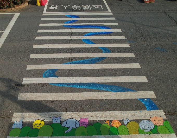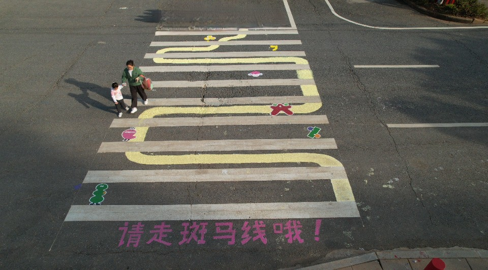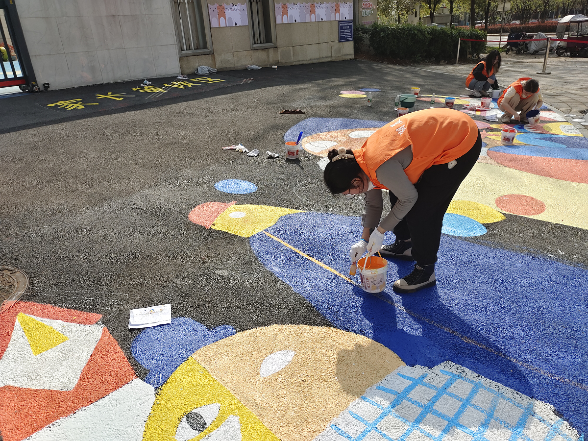 师生志愿者利用无声绘画语言,以“我爱五里界”理念为创作主体,在绘画设计中融入“多元卡通形象”、“中华非遗纹样”、“中国传统色彩”等艺术元素和“江豚”、“黄鹤楼”等荆楚IP文化符号,将中国传统文化教育、劳动教育、感恩教育、安全教育等充分展现在各个社区场景,用较强的视觉艺术色彩体现了“儿童友好”主题,充分发挥美育的隐性教育功能,帮助社区居民在美育浸润中进一步感受美、认知美、传播美,活动吸引了大量社区群众驻足拍照并参与接力绘制。