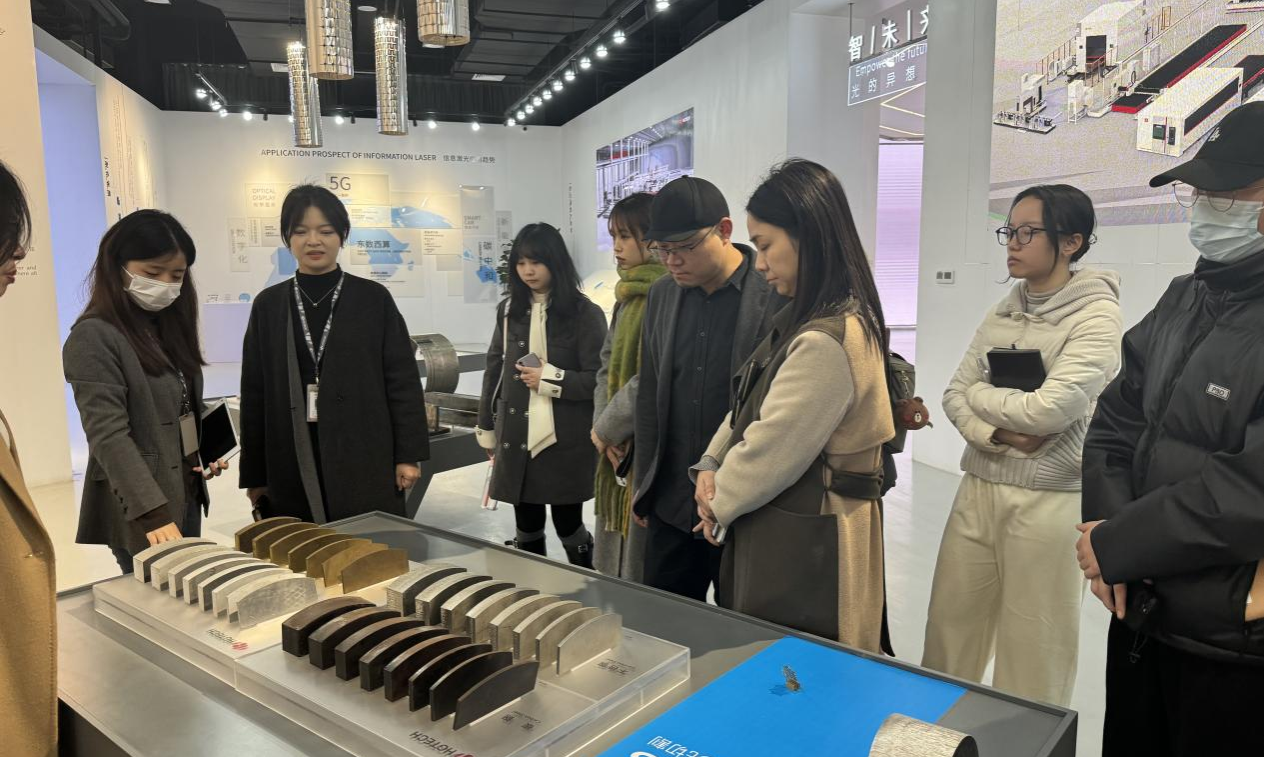 华工激光副总经理冯书云、工业设计中心总监汪若红、行政总监范云霞的陪同下参观了华工科技激光科技馆,汪若红总监详细介绍了我国激光技术的发展历程及华工激光的企业科研成果与应用领域,通过实际的技术产出,让我们直观感受到了高端技术服务新型工业化发展的生动实践。