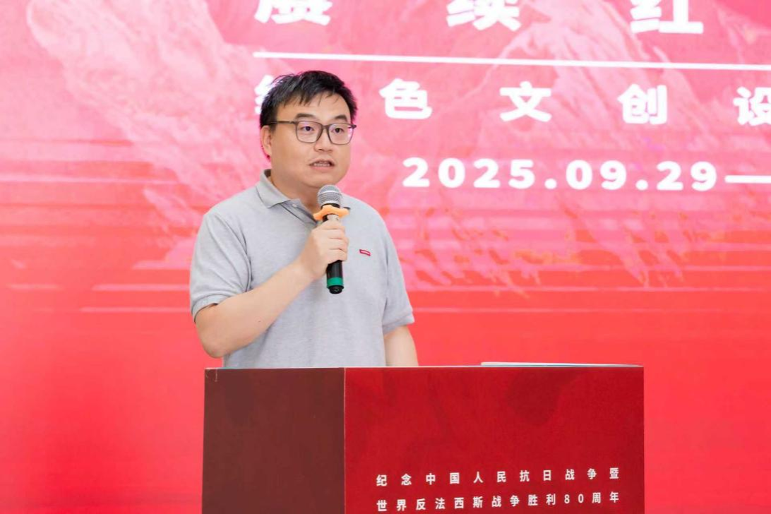 开幕式上,赵飞代表指导教师发言,本次展览围绕铸魂开物主题,从设计的本质出发,阐述了红色文创设计的精神内核与实践路径深入挖掘红色精神的当代价值,实现从叙事转译、从再现再生、从符号融入的转化,让红色文化真正融入日常生活,实现精神赓续。同时鼓励青年学子以设计为媒介,传承红色基因,展现文化自信与创新活力。