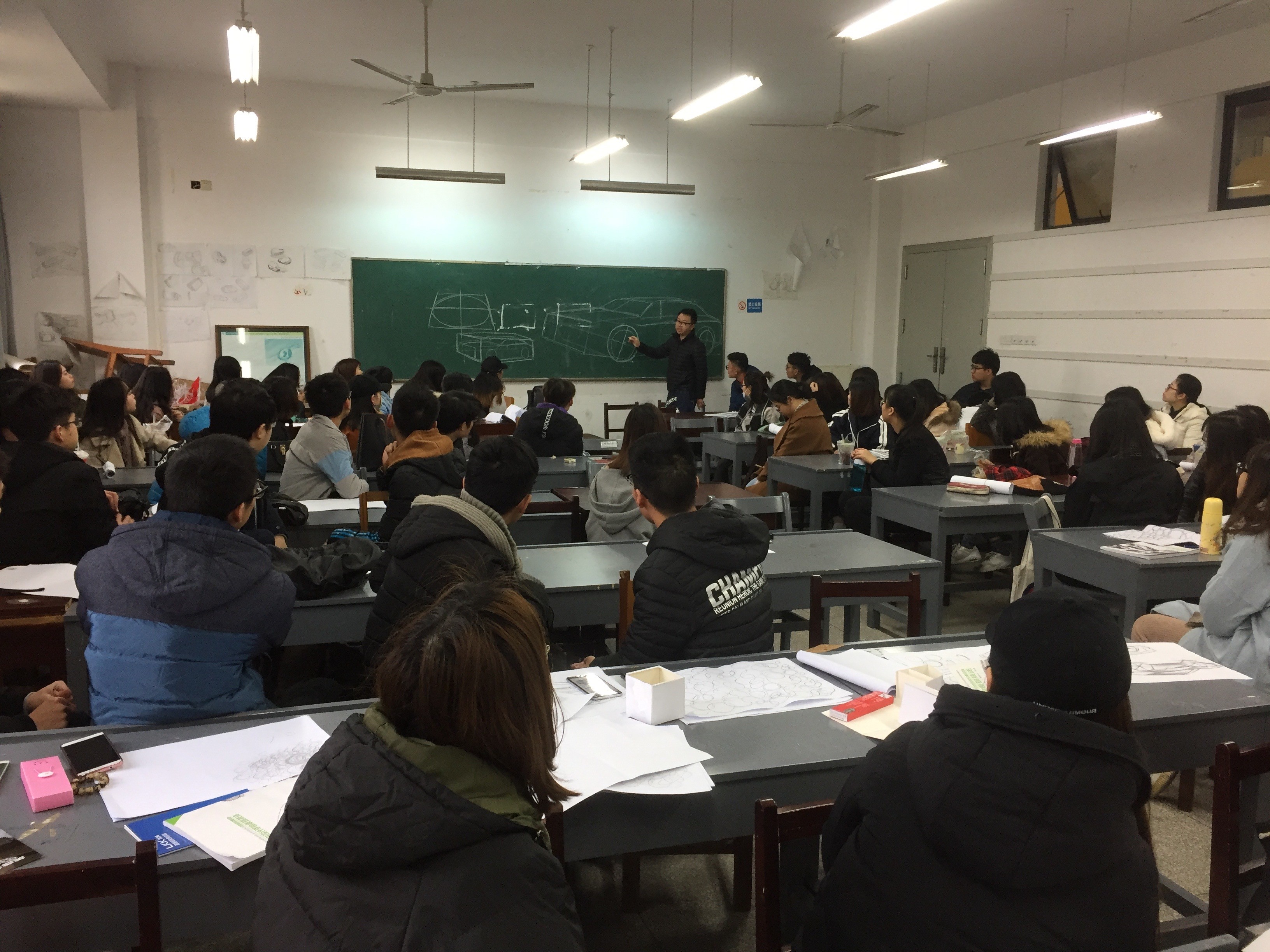 工业设计系邀请东风汽车技术总监、湖北美术产业教授郑素霖老师及其设计师团队来工业设计系为16级产品设计专业担任《产品效果图》课程。在手绘课堂内,设计师们分享交流了他们在产品手绘的心得。手绘效果图作为产品设计专业的一门必修专业基础课。对学生掌握基本的设计表现技法、理解设计、深化设计、提高设计能力有着基础铺垫作用。
