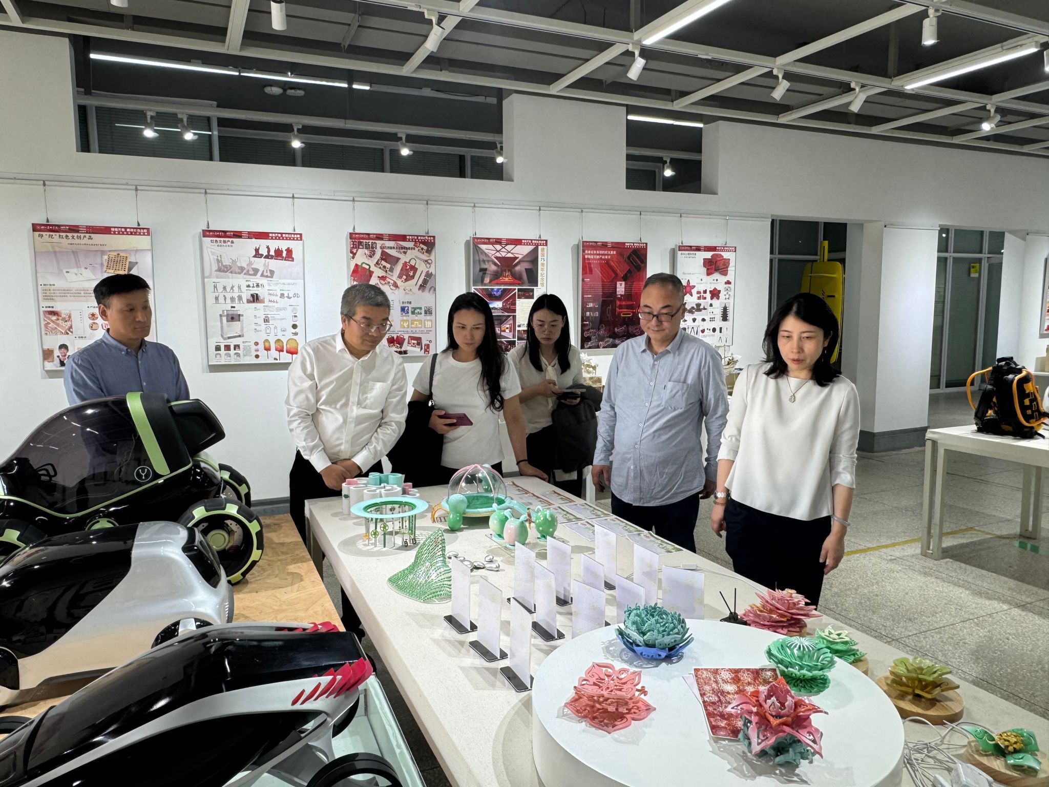 在双方的交流环节,院长助理王康通过图文方式系统介绍了学院发展历程及核心业务,重点展示了学院在服务地方经济发展领域所取得的成果。湖北交投集团审计部部长李琳对工业设计学院的专业实力高度认可,并希望与学院在非遗传承与转型、提升产品竞争力、联学共建等多方面开展合作。湖北交投集团襄阳运营公司党委书记、执行董事郭晖表示,期待双方通过本次交流,对公司在非遗传承所取得成果提供宝贵意见并展示了公司现有非遗文创产品,双方就文创产品设计优化路径进行互动交流。湖北交投集团各位领导一致认为,团队亟需专业支撑,希望依托学院平台构建长效合作机制,推动非遗产品兼具文化内涵与市场价值。湖北交投集团一行参观了工业设计学院的“铸魂开物,赓续红色血脉——红色文创设计作品展”,了解学院近几年在红色文化精神与文创产品开发融合所取得的成果。