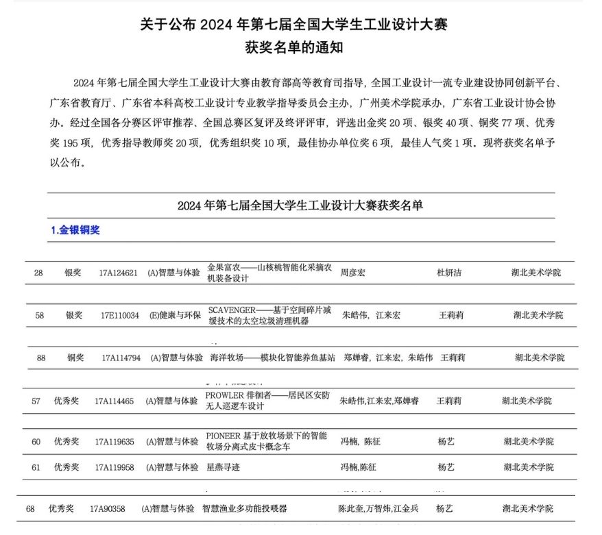 11月8日第七届全国大学生工业设计大赛颁奖典礼在广州美术学院举行。大赛由教育部高等教育司指导全国工业设计一流专业建设协同创新平台广东省教育厅、广东省本科高校工业设计专业教学指导委员会主办。经过全国各分赛区评审推荐、全国总赛区复评及终评评审公布最终获奖名单工业设计学院积极组织在杜妍洁、王莉莉、杨艺等教师的指导下,在大赛的全国终评环节中获得银2项1项优秀4的优秀成绩
