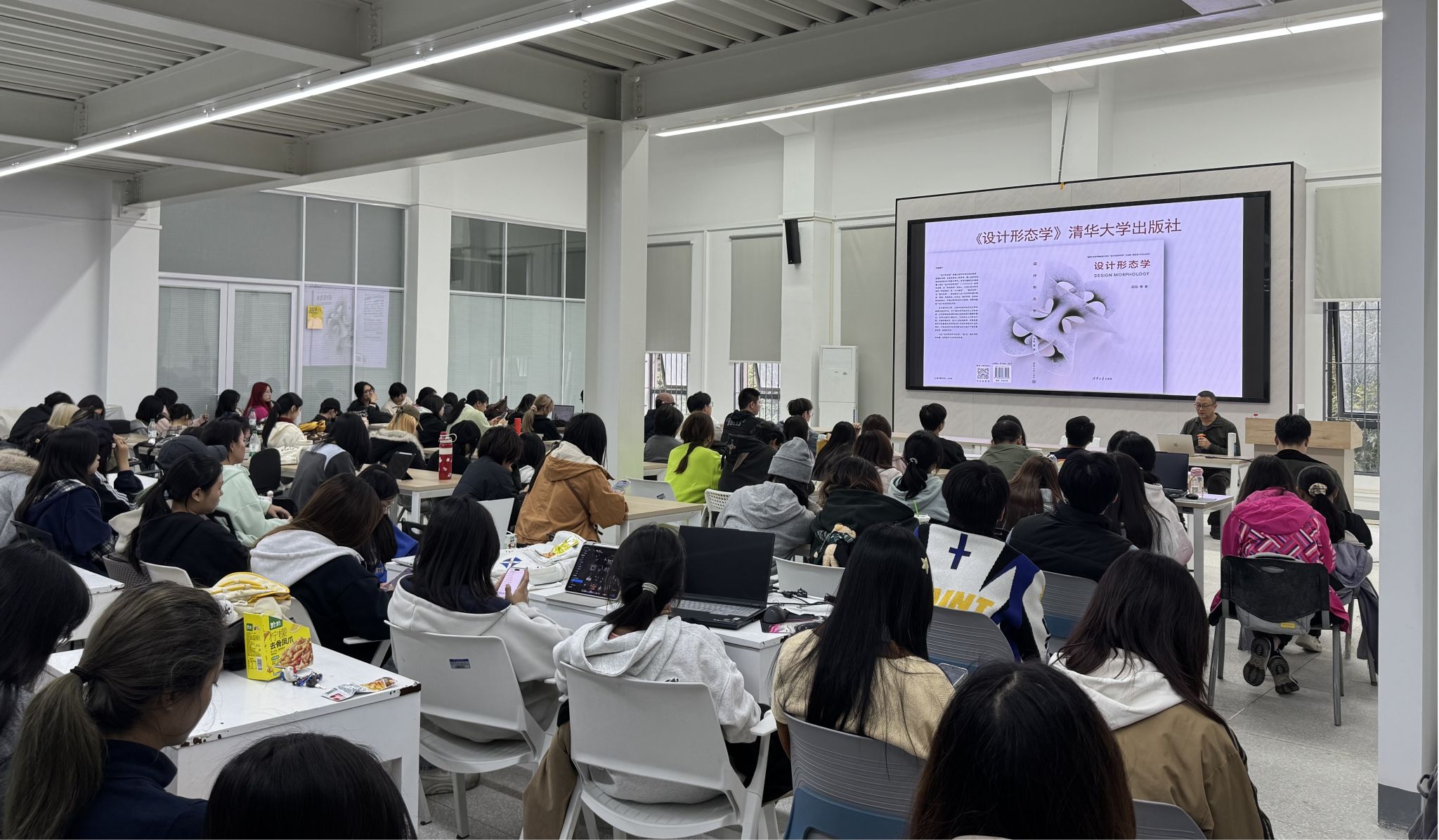 邱松教授从设计形态学的定义切入主题,结合自身多年的从教经验与实践案例,生动的为同学们诠释了设计形态学的研究方向与课题广度,并解释了何为“万物皆具天性,明其理方能悟其道;世事尽现因缘,晓其始亦可得其终”。指出在深入了解工业设计领域的核心知识点后应积极涉足获取其他学科相关知识,通过拓宽研究广度进而驱使带动研究深度。